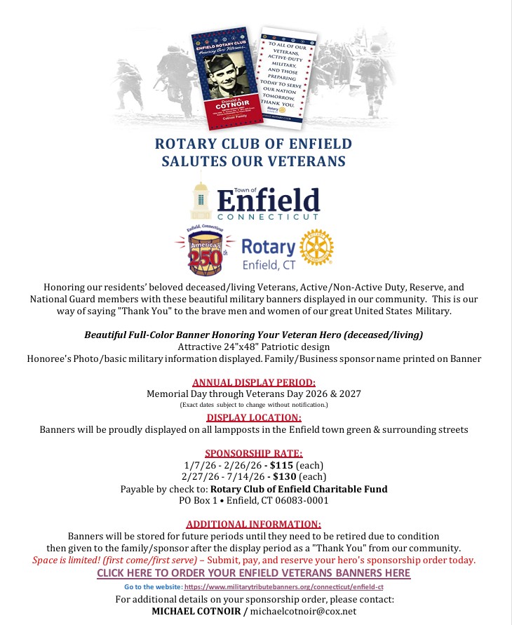 Information will be coming out shortly about the upcoming Paul Harris nomination process. We will be collecting for the Network this month. Milt and Rita Rosenberg have donated $500 as a challenge to the victims of the Kerrville Texas flood, they will donate the $500 as long as the members of the club also donate $500. The Club will also donate an additional $500. Aimee is looking for volunteers for the membership, community and vocational chairs on the board. Please reach out if you have questions or would like to like to help. Our speaker this month was Mike Emmons chair of the Enfield 4th of July committee.